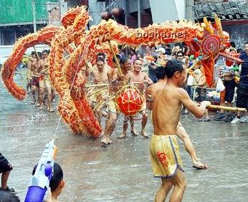 如今已發(fā)展成為對喜慶節(jié)日的慶祝,對美好生活祝福的一種方式。它用鮮棕葉作龍須,用葛藤、黃荊條、松樹枝作龍身,分9節(jié)、11節(jié)、1 3節(jié)、15節(jié)等不同長度的奇數(shù),由9至15人參加舞龍。伴著鑼、鼓、鎖吶的鏗鏘樂曲,一人持“寶”在前,龍舞歡騰時(shí)有“二龍搶寶”、“蛇蛻皮”、“烏龍絞柱”等50多種動(dòng)作玩法。與此同時(shí),身著民族服裝的群眾用臉盆、水瓢、銻桶等容器端水圍繞著龍潑澆,這樣邊舞邊潑水、水潑得越多龍舞得越歡,也預(yù)祝大家當(dāng)年風(fēng)調(diào)雨順,五谷豐登,其場面歡樂喜慶,風(fēng)趣幽默。已列入我市第一批非物質(zhì)文化遺產(chǎn)保護(hù)名錄。