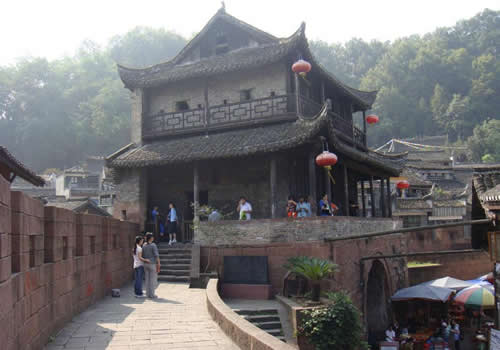 東門城樓位于城東,緊靠沱江,原名"升恒門",為鳳凰古城四大城門之一。 東門城樓始建于清康熙五十四年(1715年),城門下部由紫紅砂巖砌成,上部城樓則用古磚砌筑。城門寬3.5米,高4米,呈半圓拱,兩扇城門都用鐵皮包裹,用圓頭鐵釘密釘,牢實堅固。城墻修筑全部用紅砂條石,精工細鉆,規(guī)格一致,城墻厚0.8米,下部內(nèi)外兩側(cè)用條石加石灰漿砌成,中間填以碎石粘土,層層夯實;頂部的中間填充物改為石灰、鵝卵石、黃土拌成的三合土,厚約0.33米,上面鋪以紅砂塊石。城樓高11米,大門上方有槍眼8孔。歇山屋頂,覆以腰檐,飛檐翹角,精美壯觀。