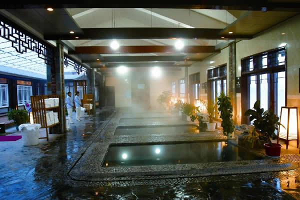 江埡溫泉主要硬件特色是高標(biāo)準(zhǔn)的自然園林式露天溫泉與室內(nèi)溫泉,建有同心池、六福湯、瀑布溫泉、石板溫泉、椰奶溫泉、花草溫泉、咖啡溫泉、紅酒溫泉等,布局體現(xiàn)出鄉(xiāng)土格調(diào),鵝卵石、青石板鋪地, 假山瀑布,小橋流水,20余種各賦特色、各具功能的溫泉池鑲嵌其中, 一派恬淡寧?kù)o的詩(shī)情畫(huà)意。