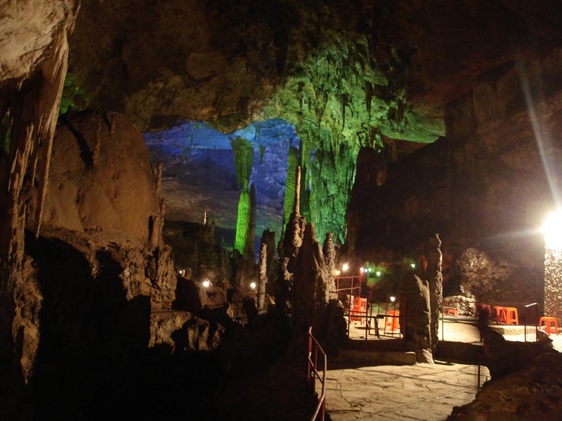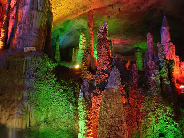 | 九天洞位于湖南張家界市桑植縣城17公里的利福塔鄉(xiāng),距市區(qū)70公里,距武陵源62公里,因洞內(nèi)有九個自然天窗九天洞而得名,總面積250公頃,是中國目前發(fā)現(xiàn)的溶洞之最,比號稱世界第一的利川溶洞大三倍。九天洞內(nèi)空氣清新,冬暖夏凉。整座洞穴分上、中、下三層,有五層不同高度的螺旋式觀景臺,最下層低于地表面400多米。經(jīng)初步探明洞內(nèi)有40個大廳、3條落差懸殊的陰河、12條瀑布、5座自生橋、10余座洞中山,此外,還有不可勝數(shù)的五光十色的鐘乳石群。在眾多迷人的景觀中尤以九星山、玉宮、水晶宮、九天玄女宮、壽星宮五大奇觀最為著名。