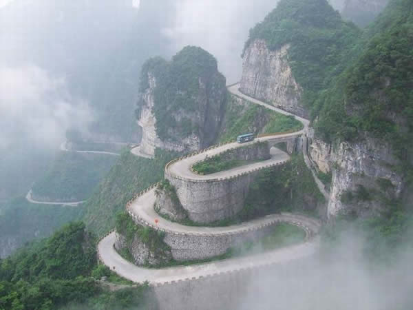 | 張家界天門山盤山公路有"通天大道"之稱,盤山公路全長10.77公里,海拔從200米急劇提升到1300米,大道兩側(cè)絕壁千仞,空谷幽深,共計99個彎,180度急彎此消彼長,似玉帶環(huán)繞,彎彎緊連,層層迭起,被譽為“天下第一公路奇觀”。