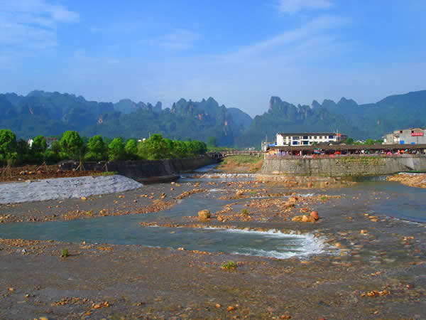 由于處于砂巖與石灰?guī)r交接處和峰林地貌比較發(fā)育,索溪峪的山?jīng)]有張家界那么峭峻,但卻也巍巍層列,站在索溪鎮(zhèn)或進(jìn)入“十里畫廊”、“西海峰林”等觀景區(qū),只見深溝幽谷中的石峰,一座簇?fù)碇蛔,綿延一、二十里,尤如一幅水墨長卷,煞是壯觀。山坳溪水旁,農(nóng)舍散落,雞犬啼鳴,房頂?shù)拇稛熝U裊,屋旁亭亭修竹,使得這里雄奇中透著清秀,幽深中帶著恬淡,粗獷中含著嬌媚,給人以心曠神怡之感。