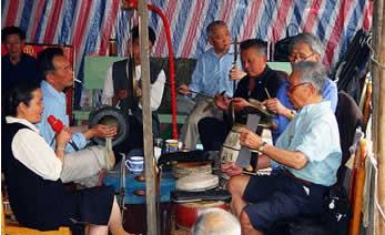 圍鼓(含嗩吶)。又稱(chēng)打鎦子、打排鼓,是民間紅白會(huì)中不可缺少的樂(lè)器。一般7人演奏,樂(lè)器有一鼓、一大鑼、一公鑼、兩副鈸、兩嗩吶。其詞曲紅白會(huì)通用,以鼓和嗩吶上系紅、白布為分別標(biāo)記(結(jié)婚不打“四字鈸”曲)。史傳的圍鼓詞有《撩子》、《火鋪》等,《撩子》分《一二三》、《閃翅》、《堆羅漢》、《反落花》等十章,《火鋪》也分《三槍》、《四進(jìn)門(mén)》、《八哥洗澡》、《蓮魚(yú)吐絲》等十章,嗩吶詞有《八十正宮》調(diào)等。在農(nóng)村,圍鼓是最普及的樂(lè)器,每逢紅白喜事都有圍鼓和嗩吶表演。
