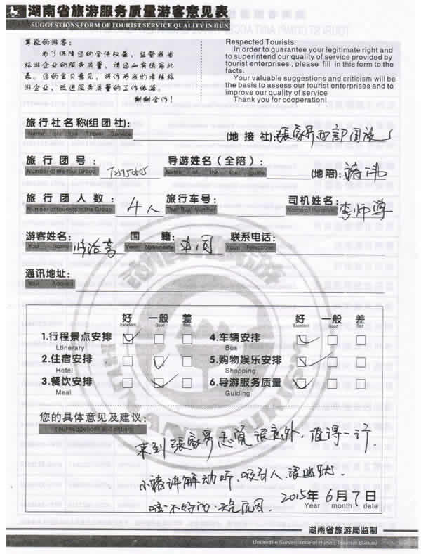 5月下旬,上海張女士一行四位貴賓與湖南西部(張家界)中國國際旅行社工作人員——龔玲取得聯(lián)系,經(jīng)過商談,雙方達(dá)成協(xié)議并簽訂旅游合同,于6月4日抵達(dá)張家界,開始張家界之旅。此次行程是由我社優(yōu)秀導(dǎo)游——褚偉,負(fù)責(zé)旅游接待工作,褚導(dǎo)在旅游過程中講解詳細(xì),客人也很滿意,在意見表上寫到:來到張家界感覺很意外,值得一行,小褚講解動(dòng)聽,吸引人,很幽默!同時(shí)也感謝張女士選擇湖南西部(張家界)中國國際旅行社,以及您對湖南西部國旅的信任與支持。我們會繼續(xù)努力,做好旅游接待工作。期待下一次與您的合作,祝您愉快!