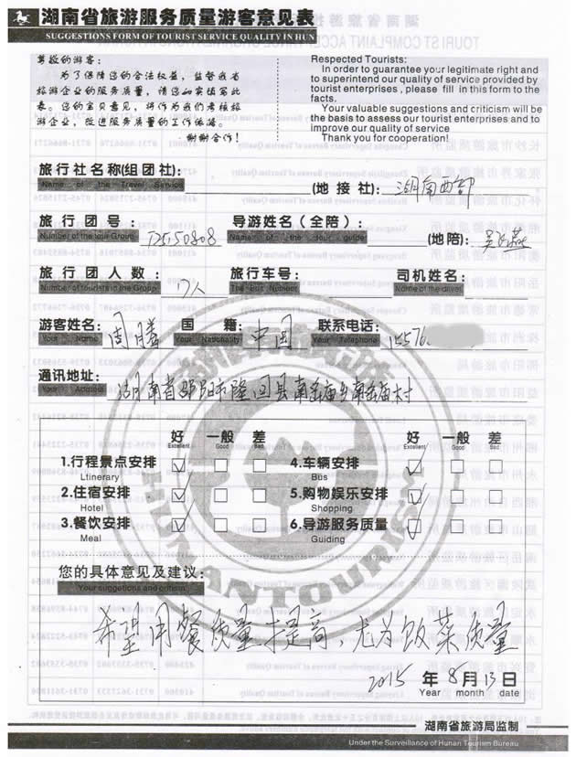 8月初,湖南邵陽周先生一行17位貴賓與湖南西部(張家界)中國國際旅行社工作人員——小王取得聯系,經過商談,雙方達成協議并簽訂旅游合同,于8月9日抵達張家界,開始張家界之旅。此次行程是由我社優(yōu)秀導游——吳飛燕負責旅游接待工作,吳導在旅游過程中講解詳細,客人也很滿意,在意見表上要求我們:希望用餐質量提商,尤為飯菜質量,我們感謝周先生為我社提出了寶貴意見,謝謝周先生。同時也感謝周先生選擇湖南西部(張家界)中國國際旅行社,以及您對湖南西部國旅的信任與支持。我們會繼續(xù)努力,做好旅游接待工作。期待下一次與您的合作,祝您愉快!