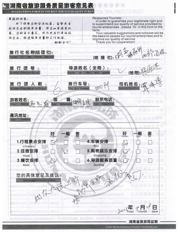 5月份,臺灣趙女士一行6位貴賓與湖南西部(張家界)中國國際旅行社工作人員——小龔取得聯(lián)系,經(jīng)過商談,雙方達成協(xié)議并簽訂旅游合同,于9月12日抵達張家界,開始張家界之旅。此次行程是由我社優(yōu)秀導游——張杰負責旅游接待工作,張導在旅游過程中講解詳細,客人也很滿意,在意見表上寫道:此次大陸之行、張家界之旅、很滿意。同時也感謝趙女士一行貴賓選擇湖南西部(張家界)中國國際旅行社,以及您對湖南西部國旅的信任與支持。我們會繼續(xù)努力,做好旅游接待工作。期待下一次與您的合作,祝您愉快!