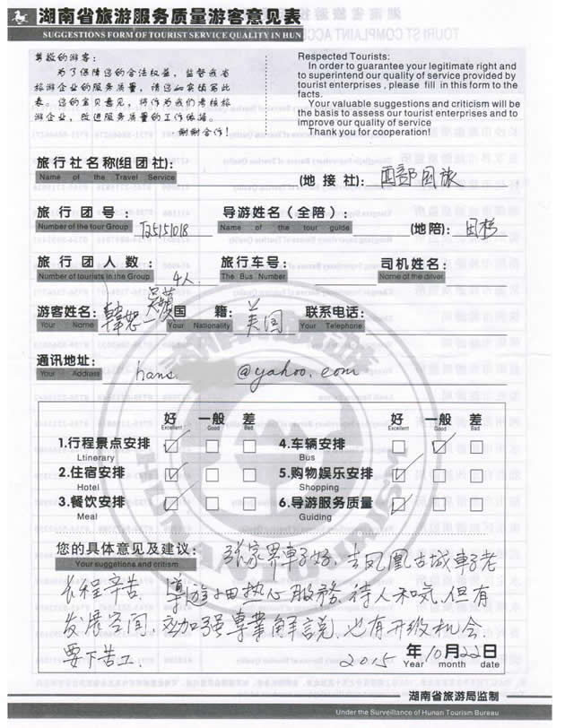 7月份,臺灣韓先生一行4位貴賓與湖南西部(張家界)中國國際旅行社工作人員——小龔取得聯(lián)系,經(jīng)過商談,雙方達成協(xié)議并簽訂旅游合同,于10月18日抵達張家界,開始張家界之旅。此次行程是由我社優(yōu)秀導游——田杉負責旅游接待工作,田導在旅游過程中講解詳細,客人也很滿意,在意見表上寫道:張家界車子好,去鳳凰古城車子老長程辛苦,導游小田熱心服務,待人和氣,但有發(fā)展空間,應加強專業(yè)解說,也有升級機會,要下苦工。同時也感謝韓先生一行貴賓選擇湖南西部(張家界)中國國際旅行社,以及您對湖南西部國旅的信任與支持。我們會繼續(xù)努力,做好旅游接待工作。期待下一次與您的合作,祝您愉快!