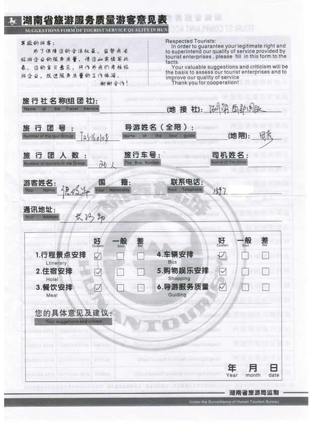 該游客接待反饋意見單掃描