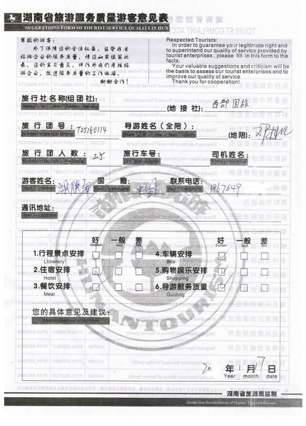 現(xiàn)在位置:首頁(yè) -> 西部國(guó)旅->旅游質(zhì)量反饋 -> 2016-1-14 廣東梁女士一行25位貴賓 張家界、袁家界、天子山三晚三日游