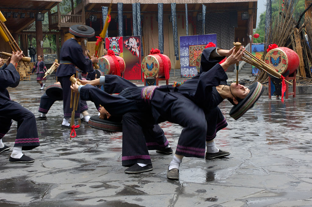 吉首市德夯風景區(qū)地處云貴高原邊緣,位于湘西土家族苗族自治州首府吉首市西郊,距吉首市24公里。德夯旅游區(qū)以矮寨為中心,東到堂樂洞、西到大龍洞,南從武山、蓮臺山開始,北到流紗瀑布(全國落差最高的流紗瀑布和瀑布群),小龍洞,總面積約190平方公里。自矮寨鎮(zhèn)洞溪上行4公里至德夯苗寨,沿岸筒車、水輾、古渡、小舟,伴以苗家吊腳樓,一派田園詩情。九龍溪穿寨而過,四周山色清幽,懸崖如削......在青山綠水間,點綴著一幢幢灰瓦石基吊腳樓,一條條光滑的石板路,一座座精巧的石拱橋,一群群赤足紅裝的浣紗苗女。還有那古老的石碾和筒車,在水力的帶動下,咕咕嚕嚕、咿咿呀呀,不知疲倦地旋轉著,一派田園詩情,這就是德夯苗寨。由于這里是純苗區(qū),苗族人民的風俗習慣對德夯影響很大,苗族人民的四月八、跳鼓舞、三月三歌會、趕秋、接龍、推牛以及苗嶺情歌,無不吸引著中外游客。因此,古樸優(yōu)雅的苗族風情又成為德夯人為景觀的特色。